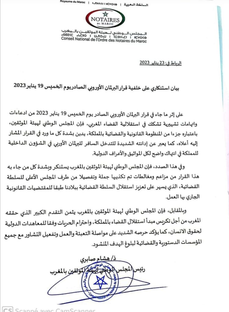 على إثر ما جاء في قرار البرلمان الأوروبي الصادر يوم الخميس 19 يناير 2023 من ادعاءات واتهامات تشهيرية تشكك في استقلالية القضاء المغربي، فان المجلس الوطني لهيئة الموثقين، باعتباره جزءا من المنظومة القانونية والقضائية بالمملكة، يدين بشدة كل ما رود في القرار المشار إليه أعلاه، كما يعبر عن ادانته الشديدة للتدخل السافر للبرلمان الأوربي في الشؤون الداخلية للمملكة في انتهاك واضح لكل المواثيق والأعراف الدولية.