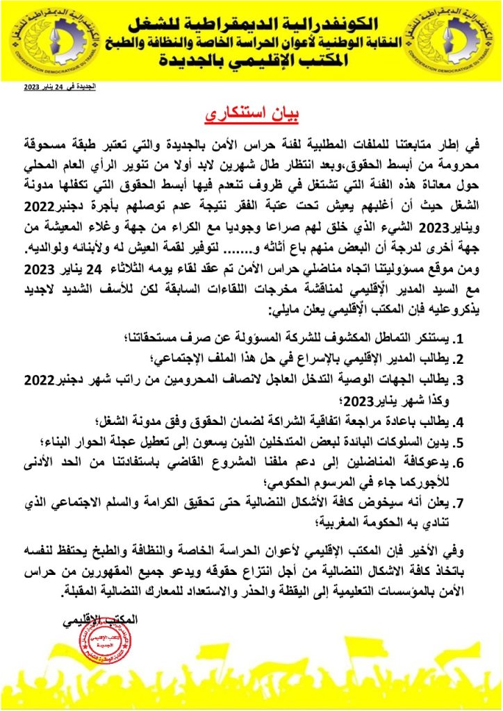 النقابة الوطنية CDT لأعوان الحراسة الخاصة والنظافة والطبخ بالجديدة: العمال خارج مدونة الشغل