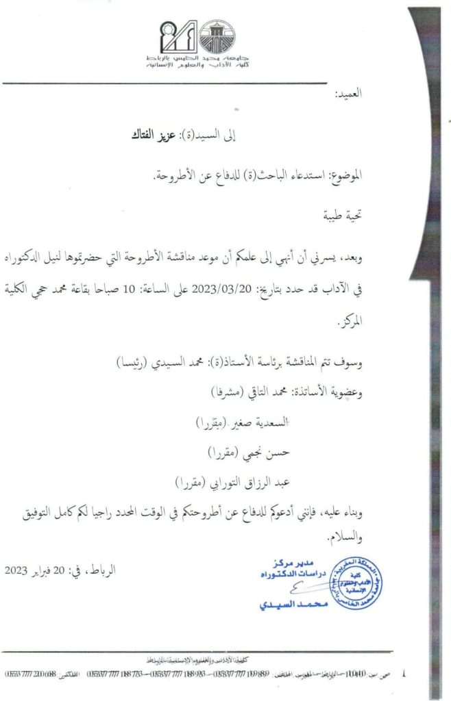 في اطار مواكبة جريدة ڤار بريس لمجموعة من الفعاليات الوطنية التي تالقت في مجموعة من المجالات سواء العلمية اوالثقافية او الرياضية . سيناقش الاستاذ عزيز الفتاك يوم الاثنين المقبل 20 مارس 2023 أطروحته لنيل شهادة الدكتوراه ” تخصص لسانيات”. تحث إشراف الأستاذ الدكتور محمد التاقي بجامعة محمد الخامس بالرباط. بعد مسار شاق وطويل بدأ بالعودة إلى رحاب المدرجات بعد انقطاع 13 سنة؛ والحصول على الإجازة ثم الماستر لتبدأ رحلة بحث الدكتوراه الذي أخذ منه مسافة زمنية قدرها ست سنوات .