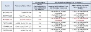ولقد تبين حسب نتائج تحاليل العينات أن التمور المستوردة من تونس الجزائر السعودية والإمارات مطابقة للمعايير الدولية فيما يتعلق ببقايا المبيدات حيث أثبتت خلوها من بقايا المبيدات المسرطنة. كما اتضح أن التمور المستوردة من الإمارات العربية المتحدة التي خضعت للتحاليل تحتوي على نسبة كبيرة من الطفيليات مما قد يؤثر على حقوق المستهلك الاقتصادية.