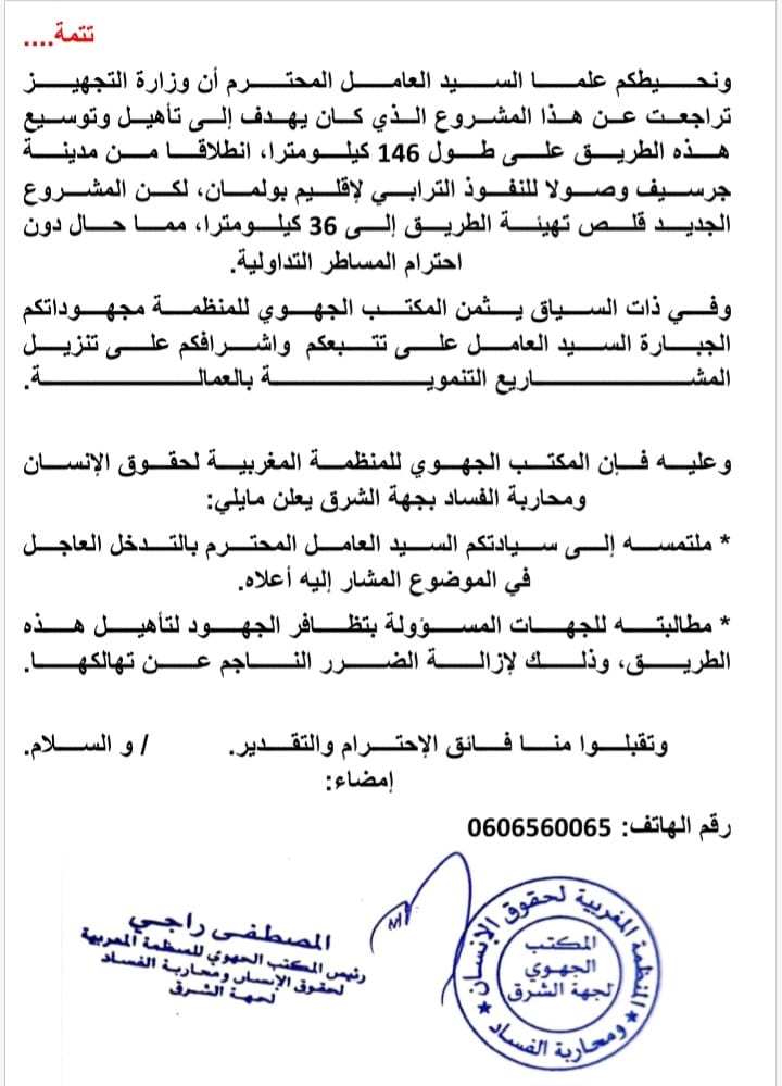 ونحيطكم علما السيد العامل المحترم أن وزارة التجهيز تراجعت عن هذا المشروع الذي كان يهدف إلى تأهيل وتوسيع هذه الطريق على طول 146 كيلومترا، انطلاقا من مدينة جرسيف وصولا للنفوذ الترابي لإقليم بولمان، لكن المشروع الجديد قلص تهيئة الطريق إلى 36 كيلومترا، مما حال دون احترام المساطر التداولية.