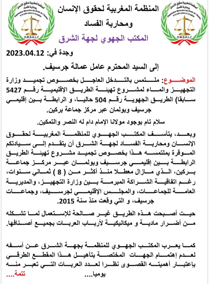 وبعد، يتأسف المكتب الجهوي للمنظمة المغربية لحقوق الإنسان ومحاربة الفساد لجهة الشرق أن يتقدم إلى سيادتكم الموقرة بملتمسه هذا بخصوص تجميد مشروع تهيئة الطريق الرابطة بين إقليمي جرسيف وبولمان عبر مركز جماعة بركين، الذي مازال معطلا منذ أكثر من ( 8 ) ثماني سنوات، رغم اتفاقية الشراكة المبرمة بين وزارة التجهيز، والمديرية العامة للجماعات، والمجلس الإقليمي لجرسيف، وجماعات جرسيف، و التي وقعت منذ سنة 2015.