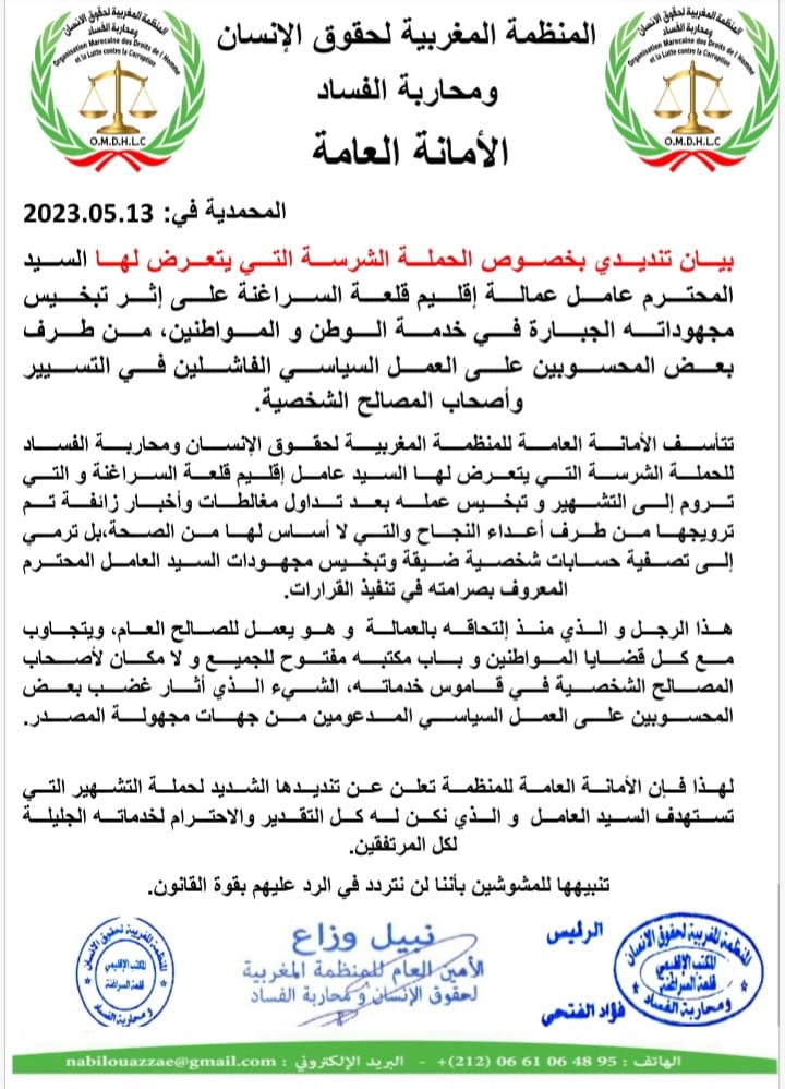 تتأسف الأمانة العامة للمنظمة المغربية لحقوق الإنسان ومحاربة الفساد للحملة الشرسة التي يتعرض لها السيد عامل إقليم قلعة السراغنة و التي تروم إلى التشهير و تبخيس عمله بعد تداول مغالطات وأخبار زائفة تم ترويجها من طرف أعداء النجاح والتي لا أساس لها من الصحة،بل ترمي إلى تصفية حسابات شخصية ضيقة وتبخيس مجهودات السيد العامل المحترم المعروف بصرامته في تنفيذ القرارات.