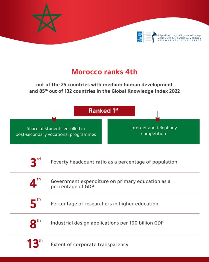 16 مايو 2023 – حلَّت المملكة المغربية في المرتبة الرابعة بين 25 دولة ذات تنمية بشرية متوسطة، والمرتبة 85 بين 132 دولة في «مؤشِّر المعرفة العالمي 2022»، الصادر عن برنامج الأمم المتحدة الإنمائي بالتعاون مع مؤسَّسة محمد بن راشد آل مكتوم للمعرفة.