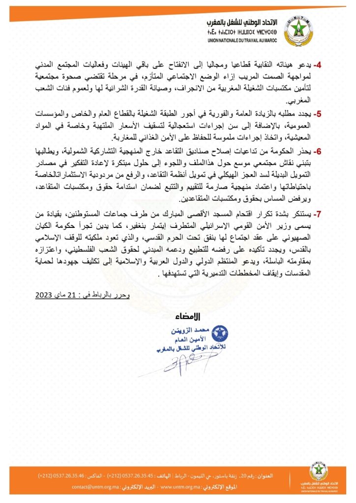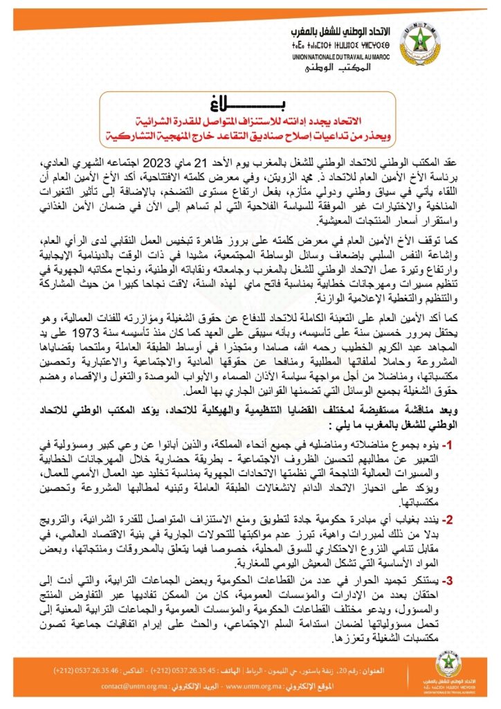وبعد مناقشة مستفيضة لمختلف القضايا التنظيمية والهيكلية للاتحاد، يؤكد المكتب الوطني للاتحاد الوطني للشغل بالمغرب ما يلي :