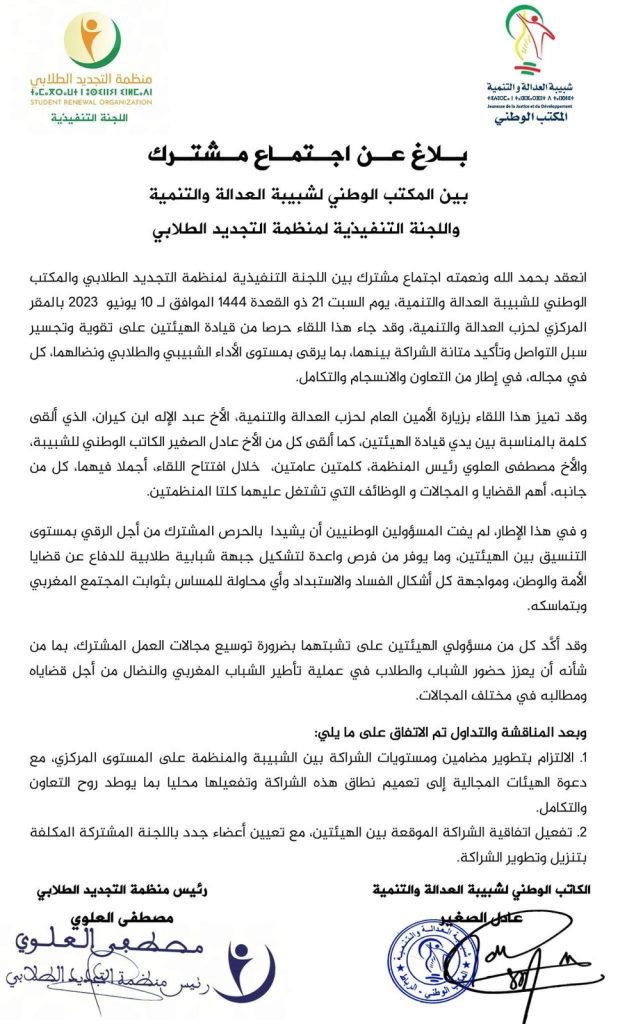 انعقد بحمد الله ونعمته اجتماع مشترك بين اللجنة التنفيذية لمنظمة التجديد الطلابي والمكتب الوطني للشبيبة العدالة والتنمية، يوم السبت 21 ذو القعدة 1444 الموافق لـ 10 يونيو 2023 بالمقر المركزي لحزب العدالة والتنمية، وقد جاء هذا اللقاء حرصا من قيادة الهيئتين على تقوية وتجسير سبل التواصل وتأكيد متانة الشراكة بينهما، بما يرقى بمستوى الأداء الشبيبي والطلابي ونضالهما، كل في مجاله، في إطار من التعاون والانسجام والتكامل.