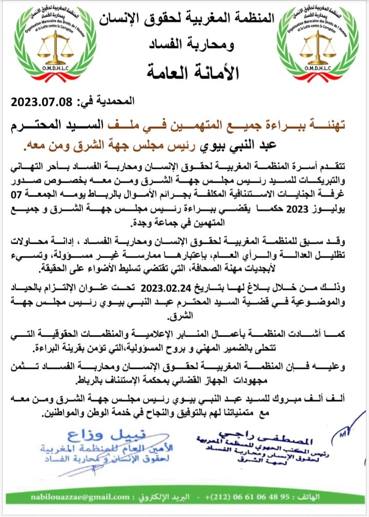 تتقدم أسرة المنظمة المغربية لحقوق الإنسان ومحاربة الفساد بأحر التهاني والتبريكات للسيد رئيس مجلس جهة الشرق ومن معه بخصوص صدور غرفة الجنايات الاستئنافية المكلفة بجرائم الأموال بالرباط يومه الجمعة 07 يوليوز 2023 حكما يقضي ببراءة رئيس مجلس جهة الشرق و جميع المتهمين في جماعة وجدة.