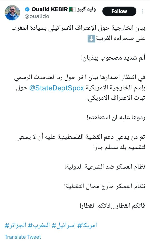 أضاف الأستاذ وليد كبير قائلاً: “في انتظار بيان آخر من وزارة الخارجية المغربية حول ردهم على التصريحات الأمريكية! اتحداهم أن يردوا عليه!” وفي رده على البيان الجزائري الذي ربط بين القضية الفلسطينية والصحراء، أضاف كبير: “من يدعي دعم القضية الفلسطينية يجب عليه عدم السعي لتقسيم بلد مسلم جار!” واختتم تغريدته بالقول: “النظام العسكري ضد الشرعية الدولية! النظام العسكري خارج التغطية! فاتكم الفوق