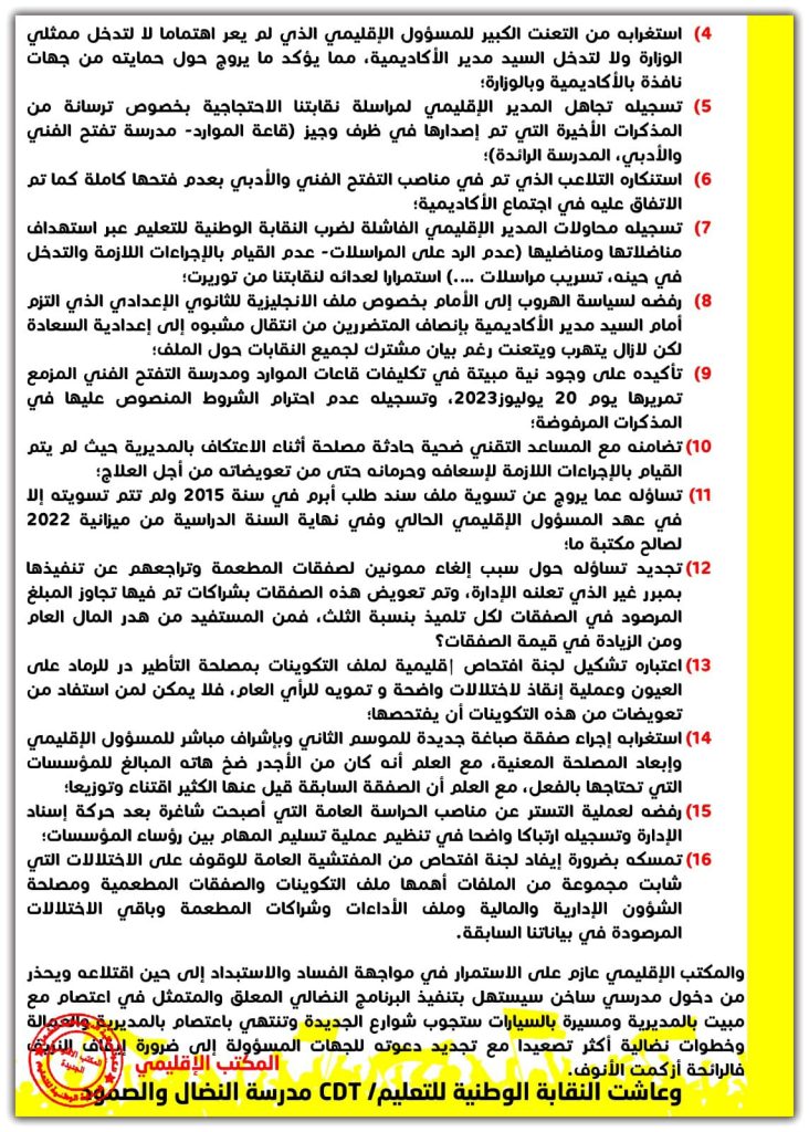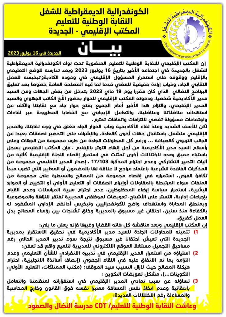 أصدر المكتب الإقليمي للنقابة الوطنية للتعليم المنضوية تحت لواء الكونفدرالية الديمقراطية للشغل بالجديدة وبعد اجتماعه الأخير بتاريخ 16 يوليوز 2023 وكذا بعد تدارسه للوضع التعليمي بالإقليم ووقوفه على استمرار المسؤول الإقليمي في وعوده الكاذبة تبخيسه للعمل النقابي الجاد، وغياب إرادة حقيقية للمضي قدما لما فيه المصلحة العامة خصوصا بعد تعليق البرنامج النضالي الذي كان مقررا يوم 19 ماي 2023 بتدخل من بعض الجهات ومن السيد مدير الأكاديمية شخصيا، ودعوته المكتب الإقليمي للحوار بحضور الأخ الكاتب الجهوي والسيد المدير الإقليمي، والتزام هذا الأخير أمام الجميع بفتح حوار جاد مع نقابتنا والكف عن استهداف مناضلاتنا ومناضلينا، والتعامل الإيجابي مع القضايا المطروحة عبر لقاءات واجتماعات مسؤولة تفضي لالتزامات واتفاقات تحترم. لكن للأسف الشديد ومنذ لقاء الأكاديمية وباب الحوار الجاد مغلق في وجه نقابتنا، والمدير الإقليمي منشغل باستقبال جهات أخرى كالعادة، والإشراف على التحضير لصفقات بعيدا عن الجانب التربوي كالصباغة … ورغم كل المحاولات الجادة من طرف مجموعة من الجهات وعلى رأسهم السيد مدير الأكاديمية من أجل إنهاء التوتر بالإقليم ، فإن المكتب الاقليمي يسجل باستياء عميق رصده لاختلالات أخرى تمثلت في استمرار إقصاء اللجنة الإقليمية كآلية من آليات التدبير التشاركي وعدم احترام المذكرة 17/103 ، إصدار المدير الاقليمي مجموعة من المذكرات الفاقدة للشرعية باعتماد مراجع لا علاقة لها بالمضمون أو المعايير التي تضرب مبدأ تكافؤ الفرص، استمراره في إقصاء مجموعة من المصالح والسيطرة على مجموعة من الملفات سواء المرتبطة بالمقاولات أوإبرام الصفقات أوالتعليم الأولي أو التخييم أوالموارد البشرية، استمرار سياسة إرضاء المحظوظين، عدم احترام سرية المراسلات وعدم القيام بإجراءات إدارية، التستر على الأشباح، تعويضات لموظفي المديرية تفتقر للنزاهة والموضوعية وبمنطق المحاباة واستهداف واضح للكونفدراليين وتبخيس أدائهم الإداري المشهود له بالكفاءة منذ سنين،احتقان غير مسبوق بالمديرية وخلق تشنجات بين رؤساء المصالح بدل العمل كفريق… إن المكتب الإقليمي وبعد مناقشة كل هاته القضايا وغيرها فإنه يعلن ما يلي: 1. تثمينه للمحاولات الجادة للسيد مدير الأكاديمية في تحقيق الاستقرار بمديرية الجديدة التي تعيش احتقانا غير مسبوق نتيجة سوء تدبير المدير الحالي رغم مساحيق التجميل مستغلا الموقع الالكتروني للمديرية لتلميع واقع قد تعفن؛ 2. استياؤه من استمرار المدير الإقليمي في تدبيره الانفرادي للشأن التعليمي وعدم التزامه بما تم الاتفاق عليه في اللقاء الجهوي (إنصاف أساتذة الانجليزية، احترام هيكلة المصالح حيث لازال التسيب سيد الموقف: (مكتب الممتلكات، التعليم الأولي، التكوينات…)، مشكل تعويضات التكوين ؛ 3. تساؤله عن سبب تمادي المدير الإقليمي في استفزازاته لمنظمتنا والتعامل بانتقائية وعدم اتخاذ نفس المسافة معتبرا نفسه فوق القانون وخارج المحاسبة والمساءلة رغم الاختلالات العديدة؛ 4. استغرابه من التعنت الكبير للمسؤول الإقليمي الذي لم يعر اهتماما لا لتدخل ممثلي الوزارة ولا لتدخل السيد مدير الأكاديمية، مما يؤكد ما يروج حول حمايته من جهات نافذة بالأكاديمية وبالوزارة؛ 5. تسجيله تجاهل المدير الإقليمي لمراسلة نقابتنا الاحتجاجية بخصوص ترسانة من المذكرات الأخيرة التي تم إصدارها في ظرف وجيز (قاعة الموارد- مدرسة تفتح الفني والأدبي، المدرسة الرائدة)؛ 6. استنكاره التلاعب الذي تم في مناصب التفتح الفني والأدبي بعدم فتحها كاملة كما تم الاتفاق عليه في اجتماع الأكاديمية؛ 7. تسجيله محاولات المدير الإقليمي الفاشلة لضرب النقابة الوطنية للتعليم عبر استهداف مناضلاتها ومناضليها (عدم الرد على المراسلات- عدم القيام بالإجراءات اللازمة والتدخل في حينه، تسريب مراسلات ….) استمرارا لعدائه لنقابتنا من توريرت؛ 8. رفضه لسياسة الهروب إلى الأمام بخصوص ملف الا
