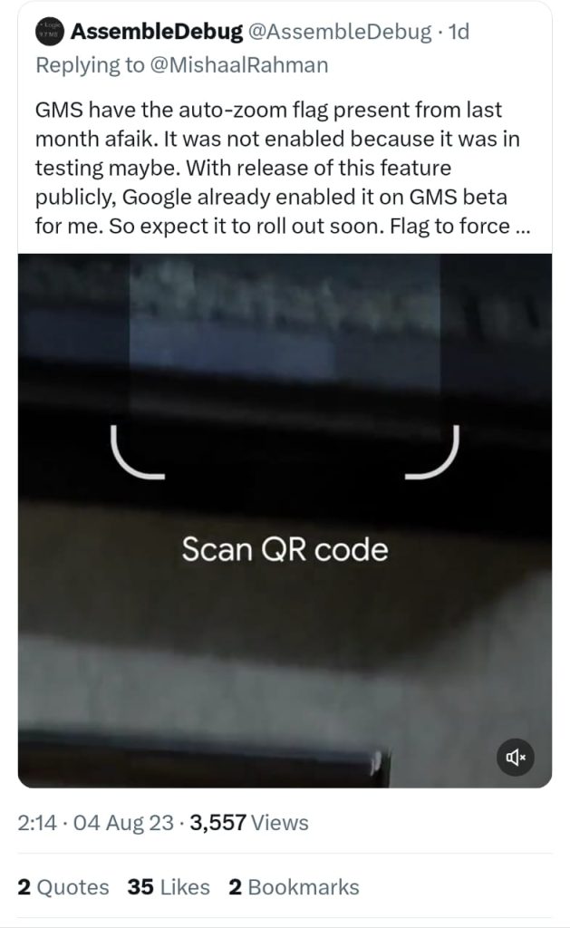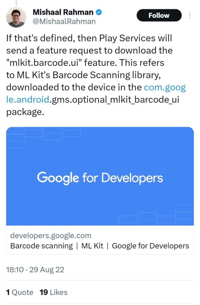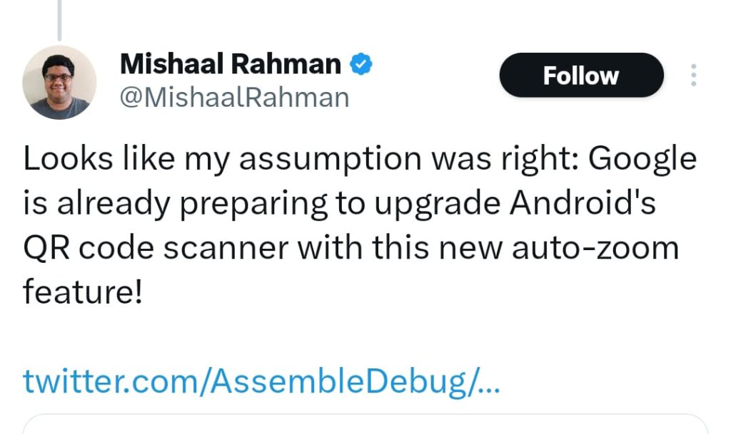 في سلسلة تغريداته الأخيرة ، لفت ميشيل رحمة الانتباه إلى التحديثات الجديدة التي أدخلتها Google في إمكانيات مسح رمز الاستجابة السريعة لنظام Android. قامت الشركة بسلاسة بدمج ميزة التكبير التلقائي في واجهة برمجة تطبيقات مسح الباركود المتوفرة ضمن “ML Kit” ، بالإضافة إلى واجهة “Code Scanner” الخاصة بها. مع هذا التقدم ، لن يكون التكبير اليدوي مطلوبًا بعد الآن لالتقاط رموز QR البعيدة.