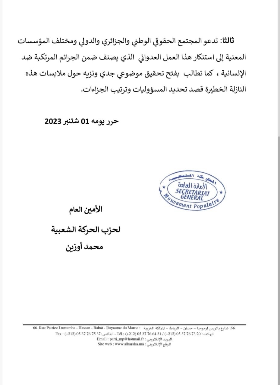 في دات السياق يتقدم حزب الحركة الشعبية بخالص العزاء والمواساة إلى عائلات الضحايا، وتمنى الشفاء العاجل