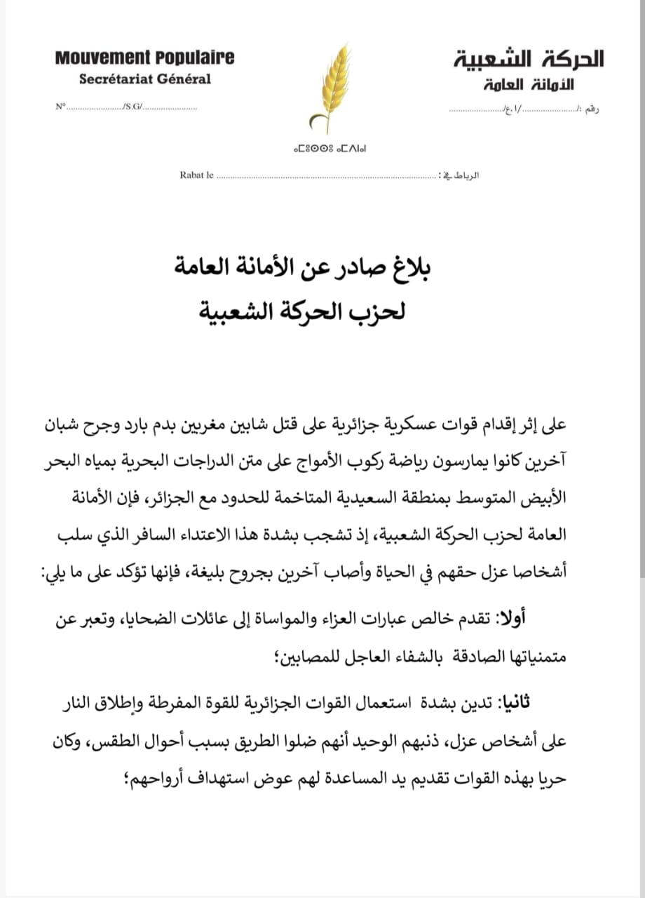 في حادثة خطيرة، قامت قوات عسكريّة جزائريّة بإطلاق النار على مجموعة من الشباب المغاربة كانوا يمارسون رياضة ركوب الأمواج على متن الدراجات البحرية في مياه البحر الأبيض المتوسط، مما أسفر عن مقتل شابين وإصابة آخرين بجروح بليغة.