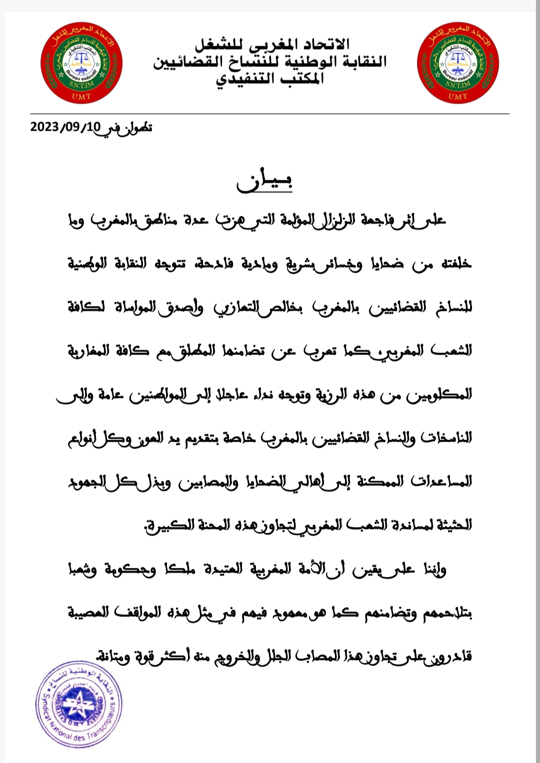 وتوجهت النقابة الوطنية للنساخ القضائيين برسالة إلى المواطنين والمنساخات والنساخ القضائيين بالمغرب، دعتهم فيها إلى تقديم يد العون إلى أهالي الضحايا والمصابين، وبذل كل الجهود الحثيثة لمساندة الشعب المغربي لتجاوز هذه المحنة الكبيرة.