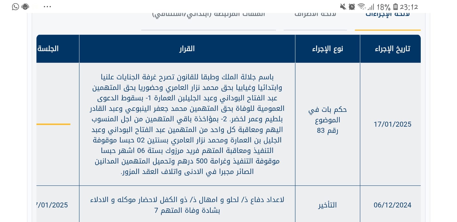 وحكمت المحكمة على المتهمين “ع.ف.و” و”ع.ج.ع” و”م.ن.ع” بسنتين حبسًا موقوف التنفيذ، وعلى المتهم “ف.م” بستة أشهر موقوفة التنفيذ وغرامة مالية قدرها 500 درهم. كما أُسقطت الدعوى العمومية بحق بعض المتهمين بسبب الوفاة.