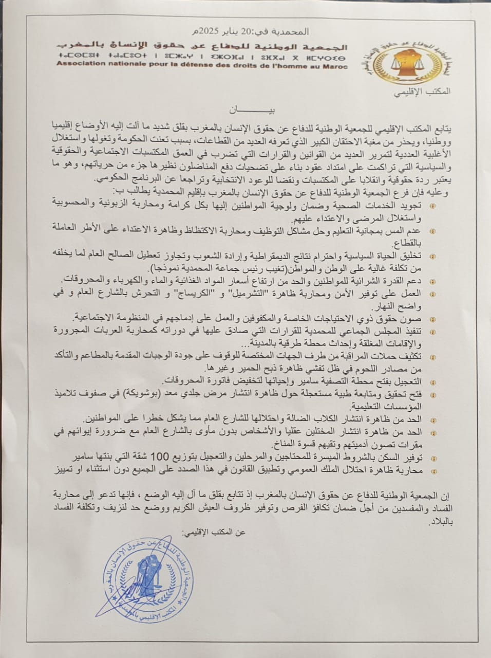 أصدر المكتب الإقليمي للجمعية الوطنية للدفاع عن حقوق الإنسان بالمغرب بيانا عبر فيه عن قلق شديد بسبب ما آلت إليه الأوضاع إقليميا ووطنيا، وحذر من مغبة الاحتقان الكبير الذي تعرفه العديد من القطاعات، بسبب تعنت الحكومة وتغولها واستغلال الأغلبية العددية لتمرير العديد من القوانين والقرارات التي تضرب في العمق المكتسبات الاجتماعية والحقوقية والسياسية التي تراكمت على امتداد عقود بناء على تضحيات دفع المناضلون نظيرها جزء من حرياتهم، وهو ما اعتبره مكتب الجمعية ردة حقوقية وانقلابا على المكتسبات ونقضا للوعود الانتخابية وتراجعا عن البرنامج الحكومي.