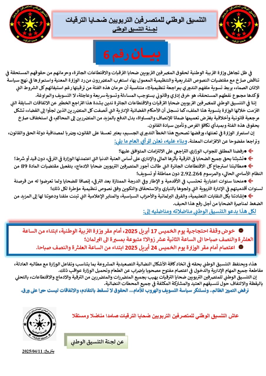 هذا، ويحتفظ التنسيق الوطني بحقه في اتخاد كافة الأشكال النضالية التصعيدية المشروعة بما يتناسب وتفاعل الوزارة مع مطالبه العادلة مقاطعة جميع المهام الإدارية والدخول في اعتصام مفتوح مصحوبا بإضراب عن الطعام وتحميل الوزارة عواقب ذلك.