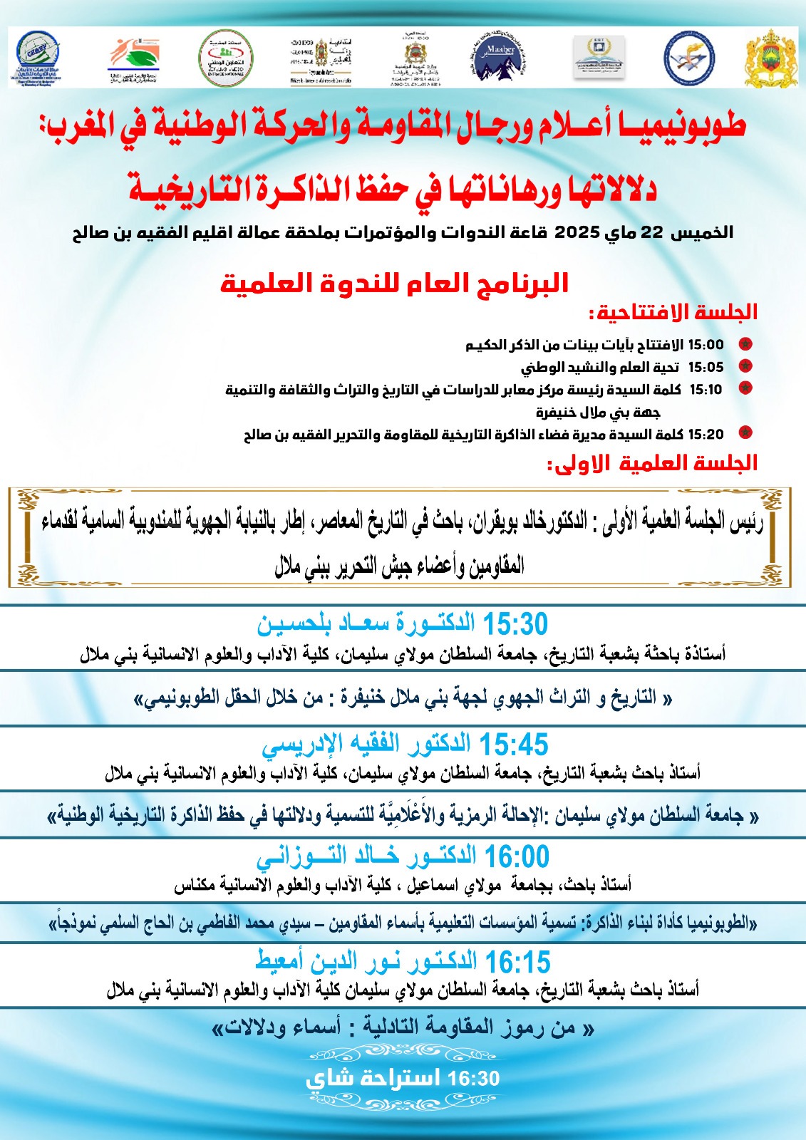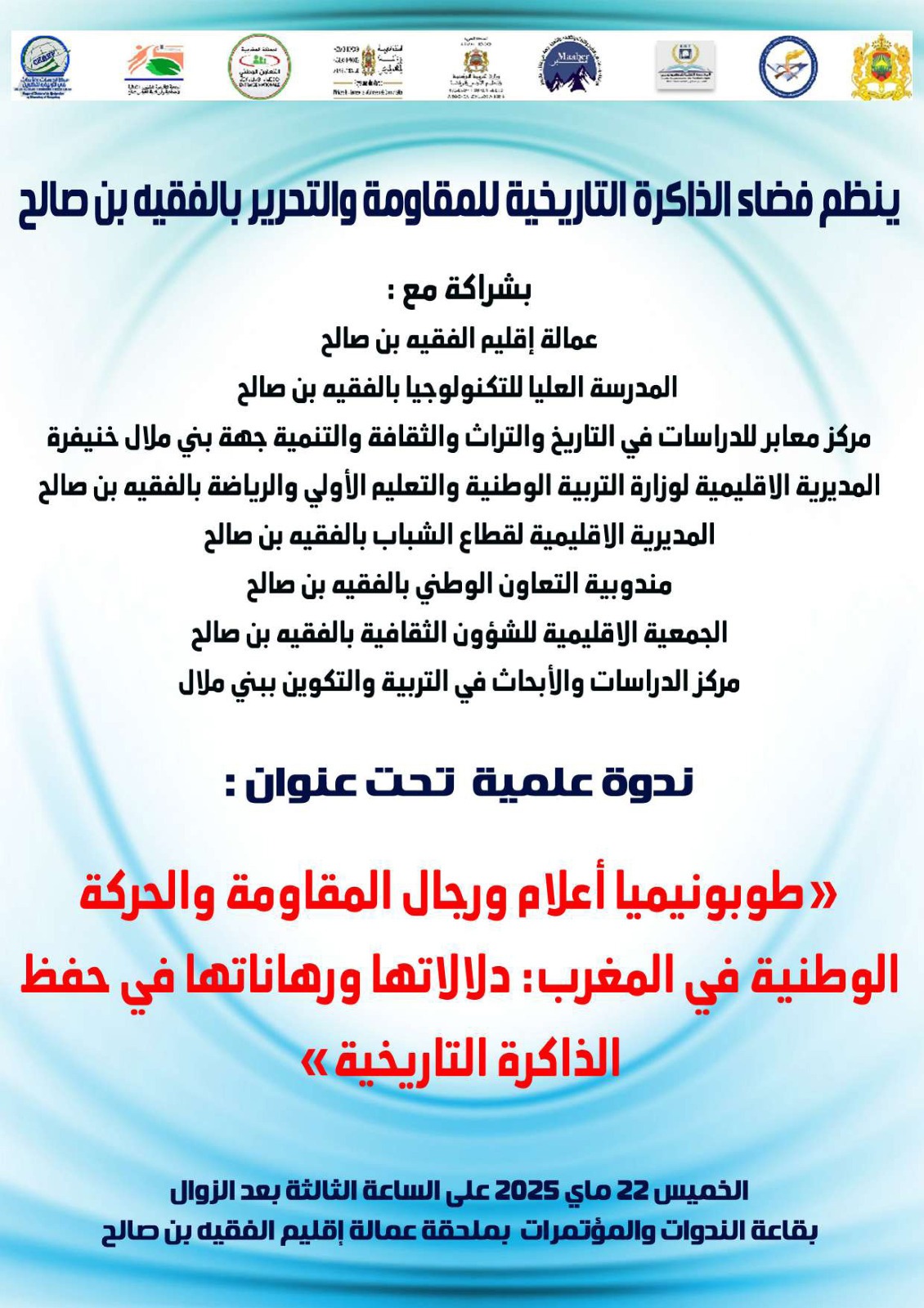 في مبادرة علمية اخرى وكعادته ينظم فضاء الذاكرة التاريخية للمقاومة والتحرير بالفقيه بن صالح ندوة علمية موسومة ب “طوبونيميا اعلام ورجال الحركة الوطنية في المغرب : دلالاتها ورهاناتها في حفظ الذاكرة التاريخية ” زوال يوم الخميس 22 ماي 2025 برحاب قاعة الندوات و المؤتمرات بملحقة عمالة إقليم الفقيه بن صالح ،بشراكة مع :
