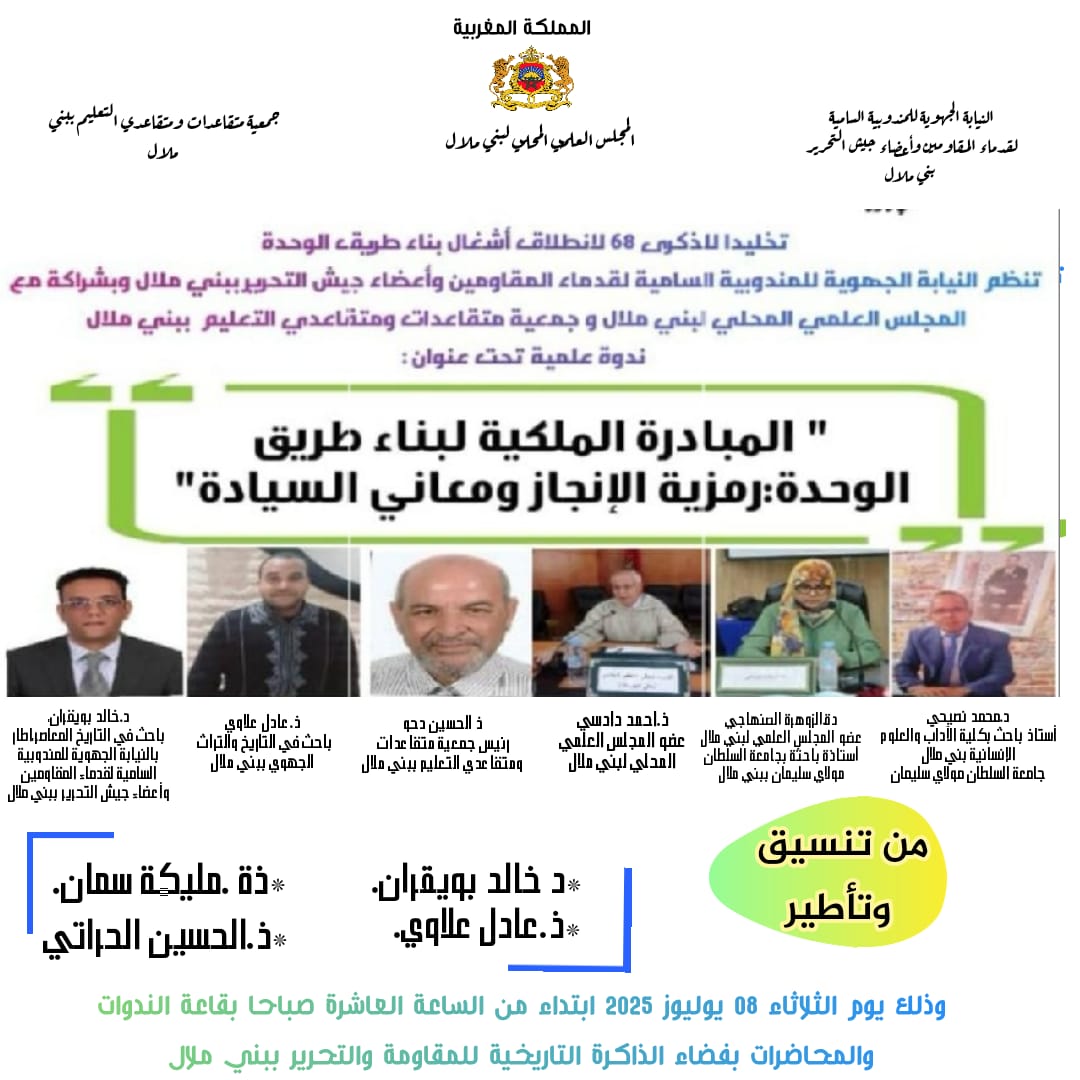 احتفاءً بالذكرى الثامنة والستين لانطلاق أشغال بناء طريق الوحدة، احتضن فضاء الذاكرة التاريخية للمقاومة والتحرير ببني ملال، صباح يوم الثلاثاء 8 يوليوز 2025، ندوة علمية وازنة نظمتها النيابة الجهوية للمندوبية السامية لقدماء المقاومين وأعضاء جيش التحرير ببني ملال، بشراكة مع المجلس العلمي المحلي لبني ملال وجمعية متقاعدات ومتقاعدي التعليم، تحت عنوان: