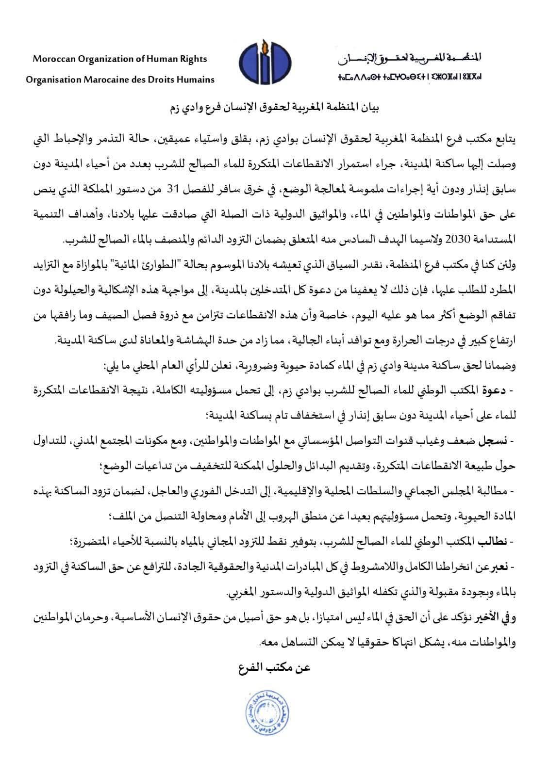 وضمانا لحق ساكنة مدينة وادي زم في الماء كمادة حيوية وضرورية، نعلن للرأي العام المحلي ما يلي: