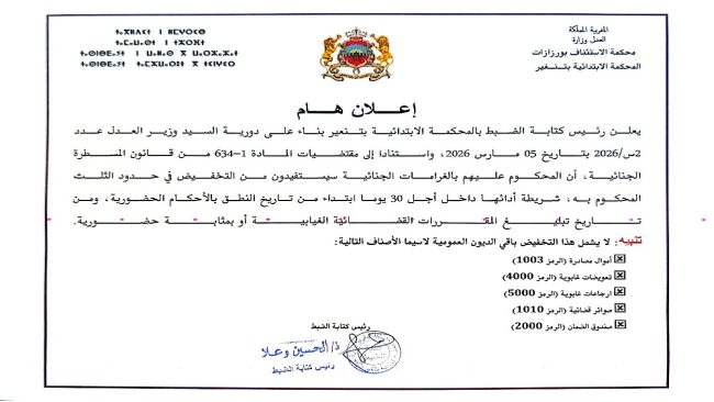 أصدرت كتابة الضبط بالمحكمة الابتدائية بتنغير إعلاناً موجهاً إلى العموم، يفيد باتخاذ إجراء استثنائي يهم تخفيض الغرامات الجزائية لفائدة المحكوم عليهم، وذلك تنفيذاً لدورية صادرة عن وزير العدل.